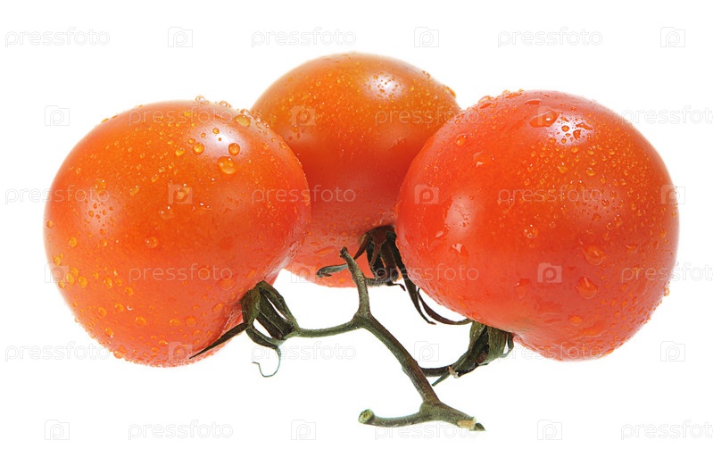 Свежие три красных томата с каплями воды, изолированные на белом