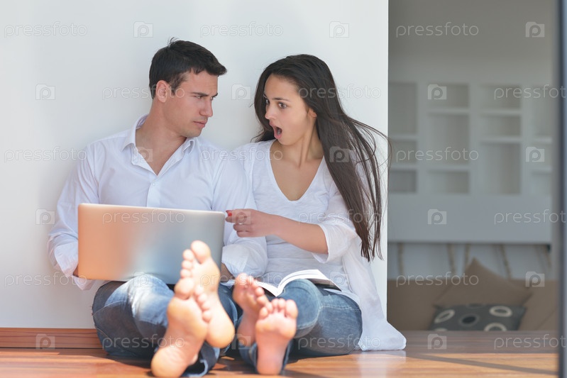 Молодая пара с ноутбуком отдыхает дома