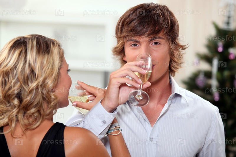 Молодая пара пьет шампанское на Рождество
