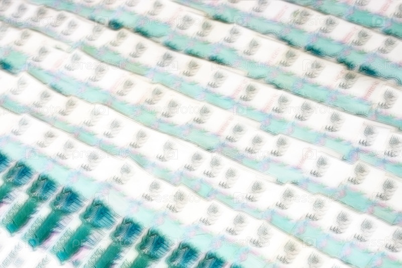 Денежные купюры достоинством в одну тысячу рублей, выложенные рядами