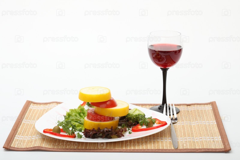 Бокал вина, салат на белом блюде и вилка на коричневой салфетке
