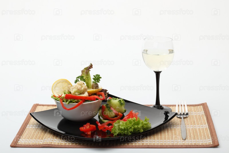 Бокал вина, салат на черном блюде и вилка на коричневой салфетке