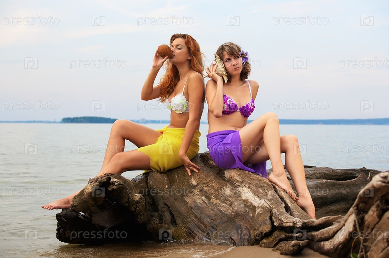 Две красивые девушки с кокосом и ракушкой сидят на морском берегу