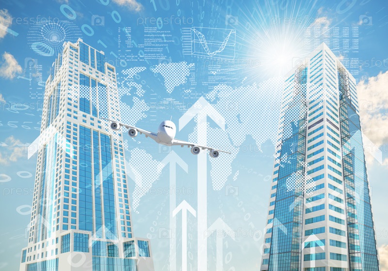 Самолет, небоскребы и карта мира