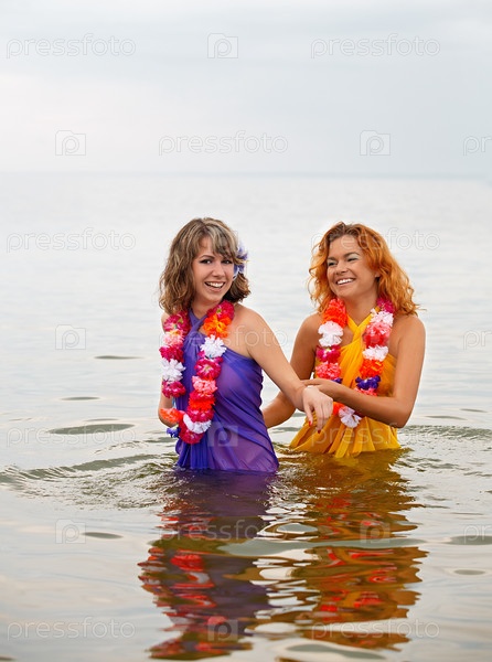 Две красивые девушки с венками купаются в море