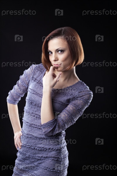 Стройная девушка в сером платье на черном фоне