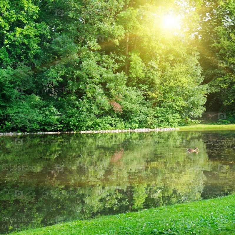Летний парк, река, рассвет