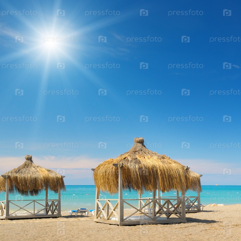 Пляж, бунгало, синее небо и солнце
