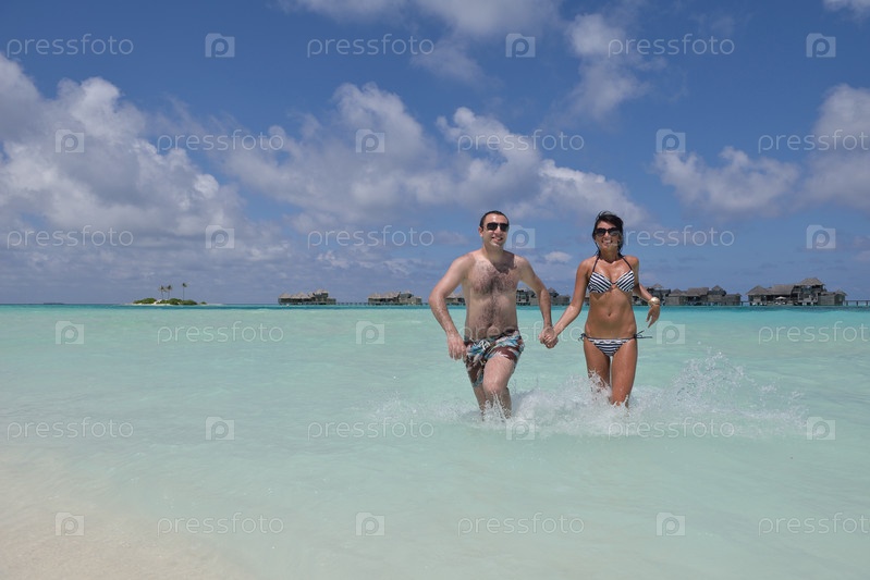 Счастливая молодая пара отдыхает на пляже