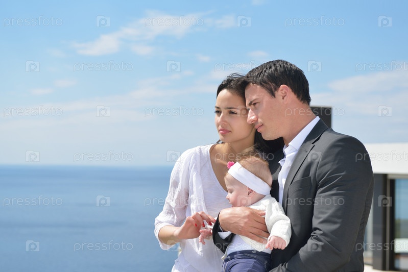 Счастливая молодая семья у дома