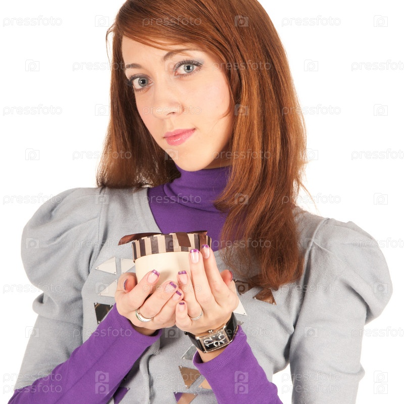 Портрет красивой девушки с подарочной коробочкой на белом фоне