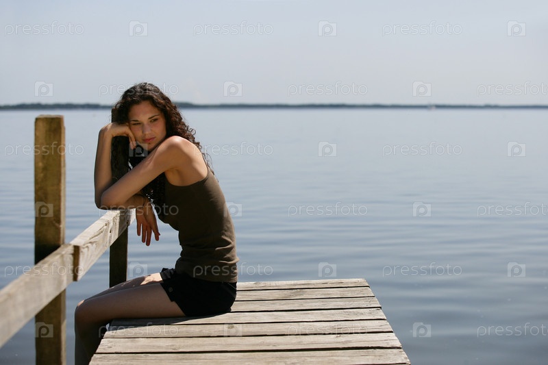 Брюнетка сидит на краю мола