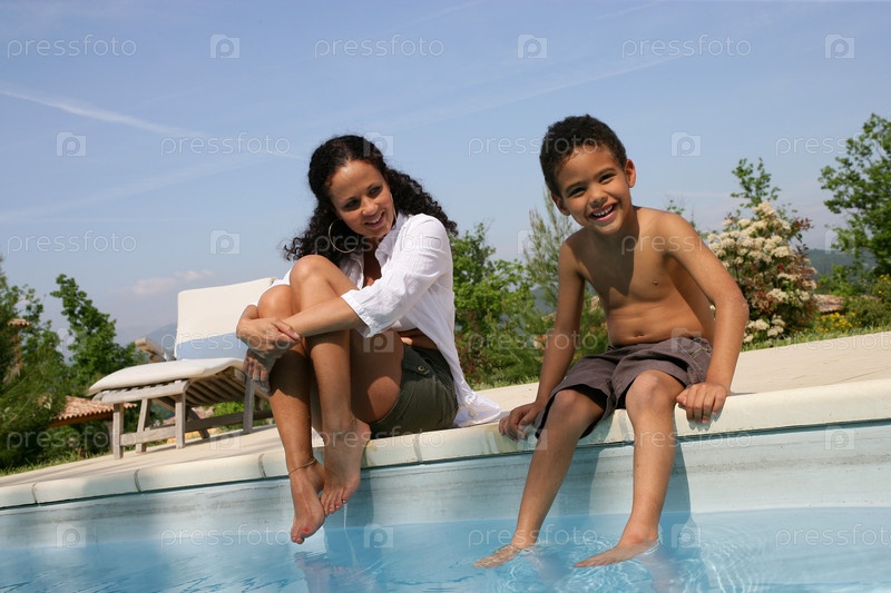 Мать и сын у бассейна