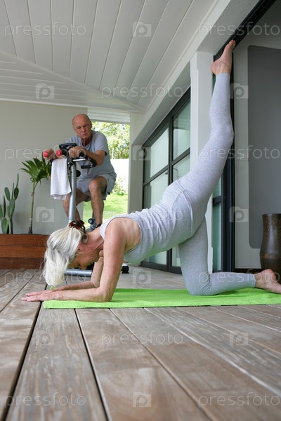Пожилые люди делают гимнастику