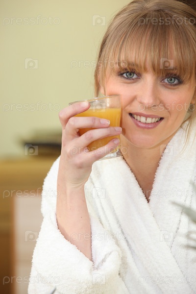 Молодая женщина держит стакан апельсинового сока