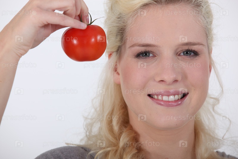 Блондинка с томатом в руке