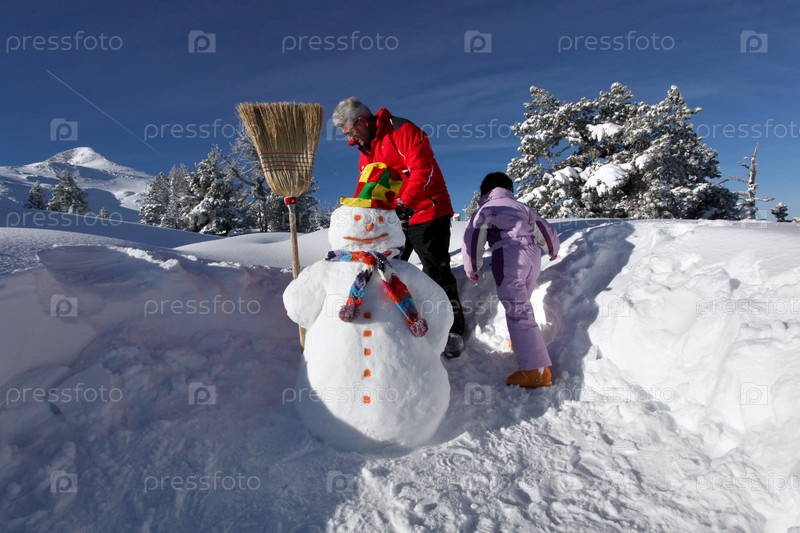 Отец и дочь лепят снеговика