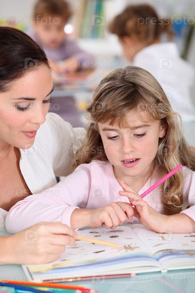 Учитель помогает ученице в классе