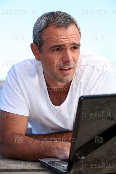 Мужчина с ноутбуком на свежем воздухе