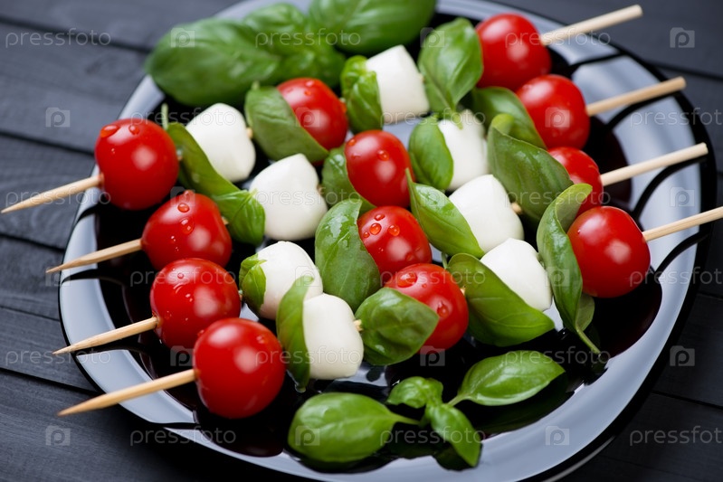 Шашлыки с моцареллой, помидорами и листьями базилика