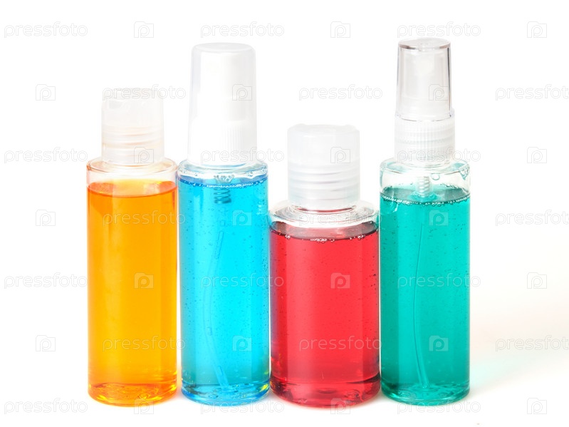 Жидкое мыло, гель, шампунь, масло на белом фоне