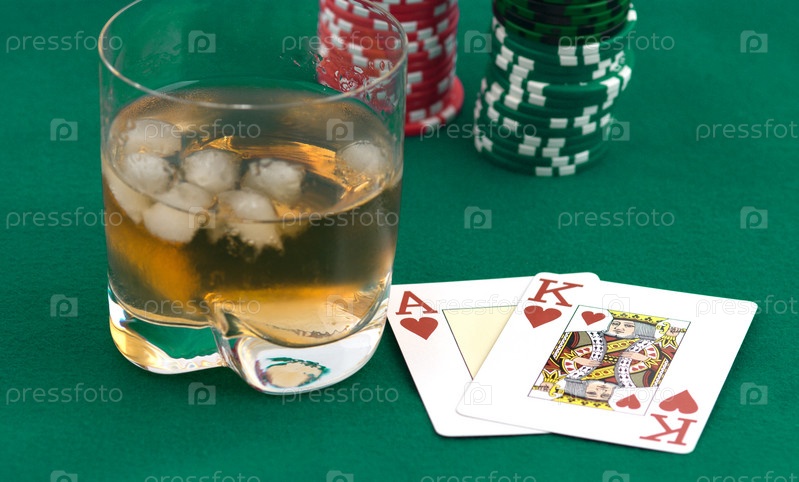 Куча прилавков, игровых карт и бокал виски с льдом на зеленой ткани
