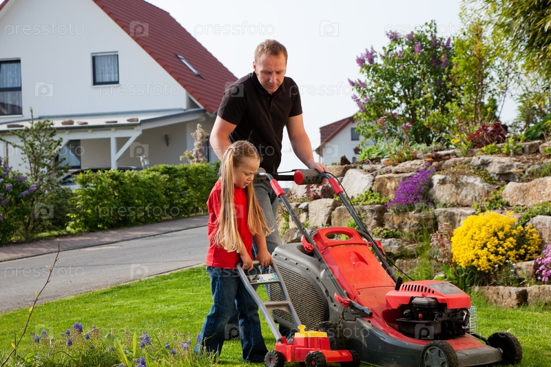 Отец и дочь косят газон