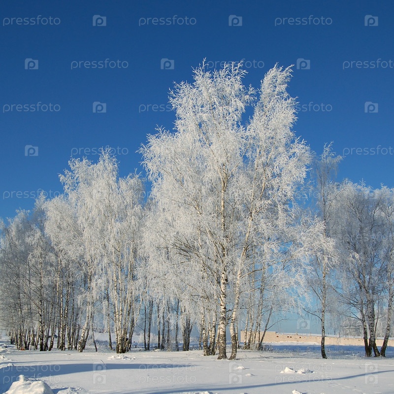 Березы, покрытые инеем, в зимнем поле