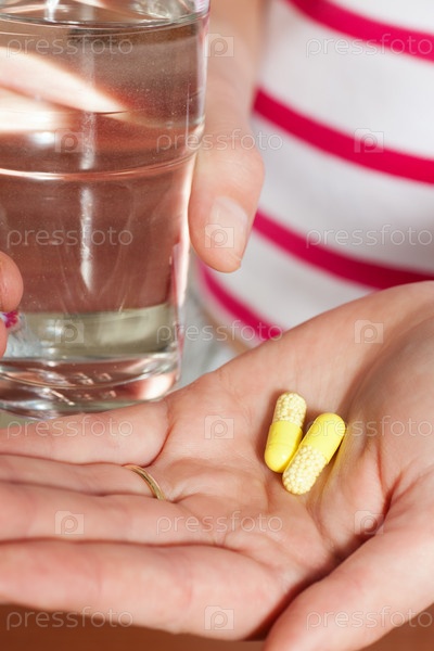 Женщина кладет в рот таблетку