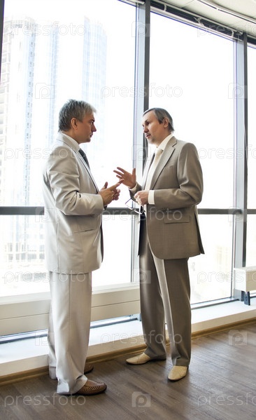 Двое пожилых мужчин в офисе обсуждают проблему