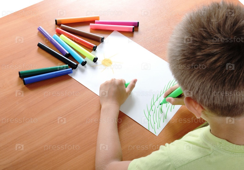 Мальчик рисует фломастерами