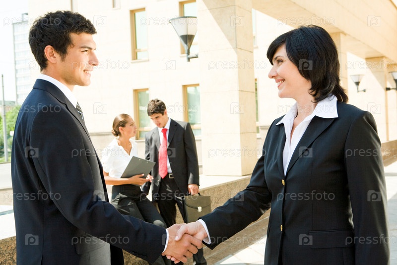 Фото успешных людей, рукопожатые с партнерами по работе на заднем плане