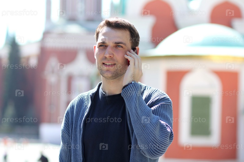 Молодой мужчина звонит по мобильному телефону, стоя на улице