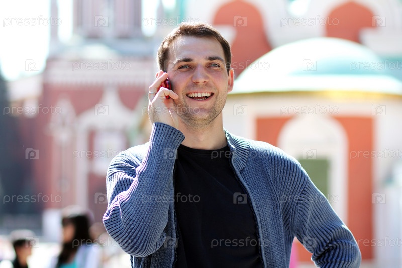 Счастливый молодой мужчина звонит по мобильному телефону, стоя на улице
