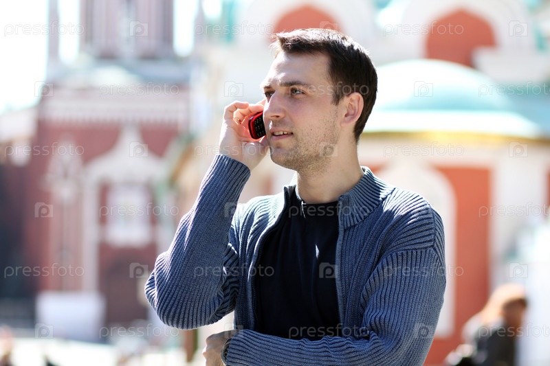Молодой мужчина звонит по мобильному телефону, стоя на улице