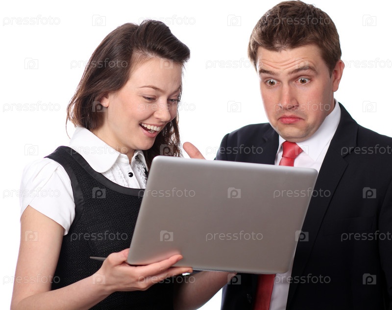 Деловые мужчина и женщина с ноутбуком на белом фоне