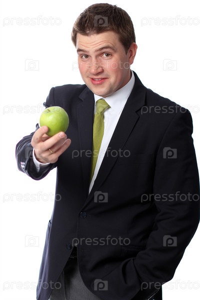 Молодой бизнесмен с зеленым яблоком на белом фоне