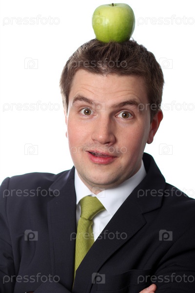 Молодой бизнесмен с зеленым яблоком на голове на белом фоне