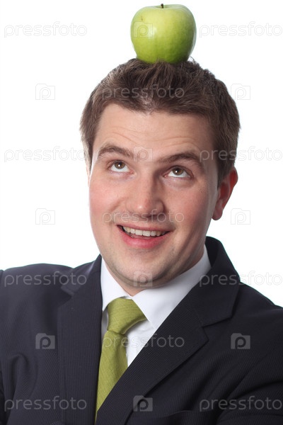 Молодой бизнесмен с зеленым яблоком на голове на белом фоне