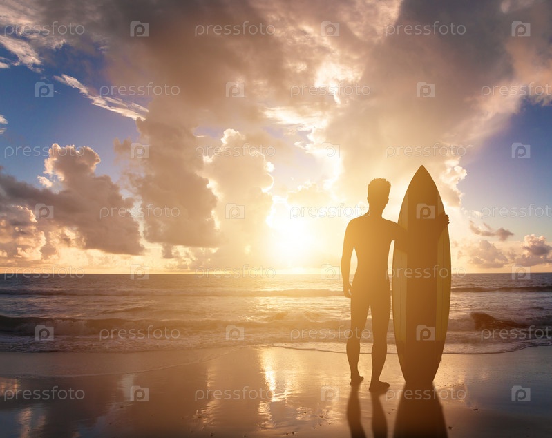 Серфер наблюдает восход солнца