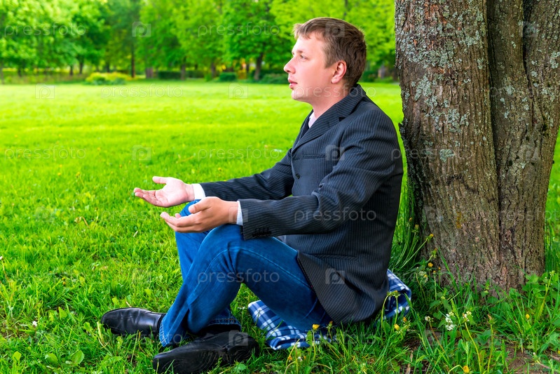 Бизнесмен отдыхает в парке возле дерева