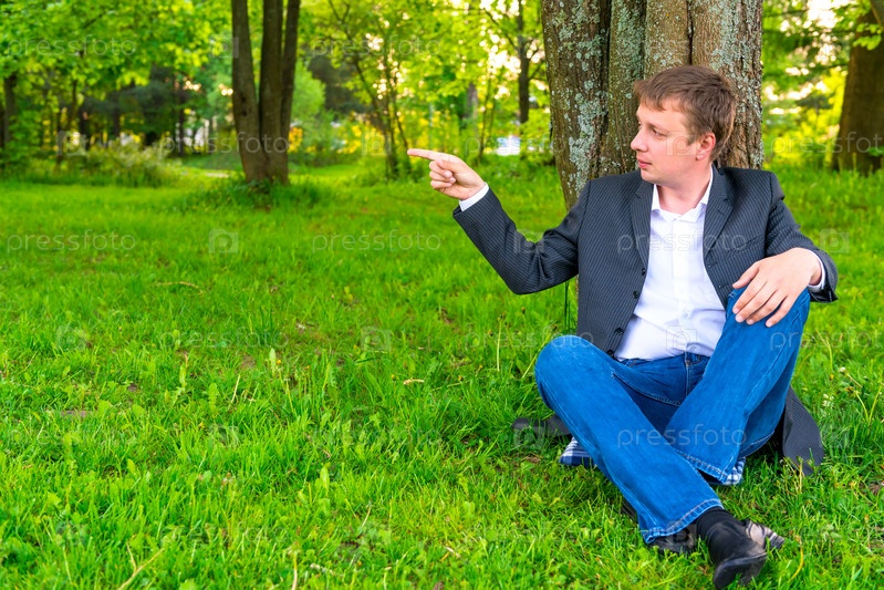 Бизнесмен отдыхает в парке возле дерева