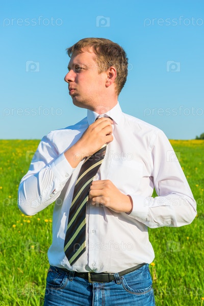 Мужчина поправляет галстук