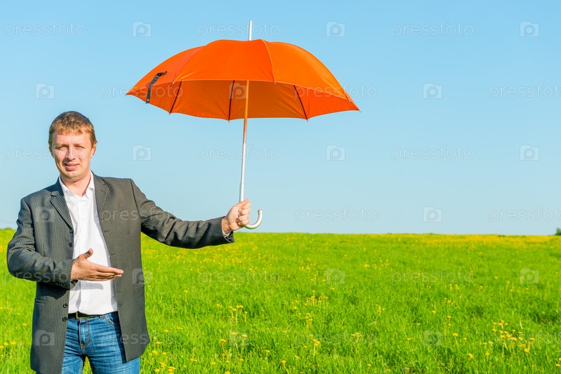 Деловой мужчина с зонтом в поле