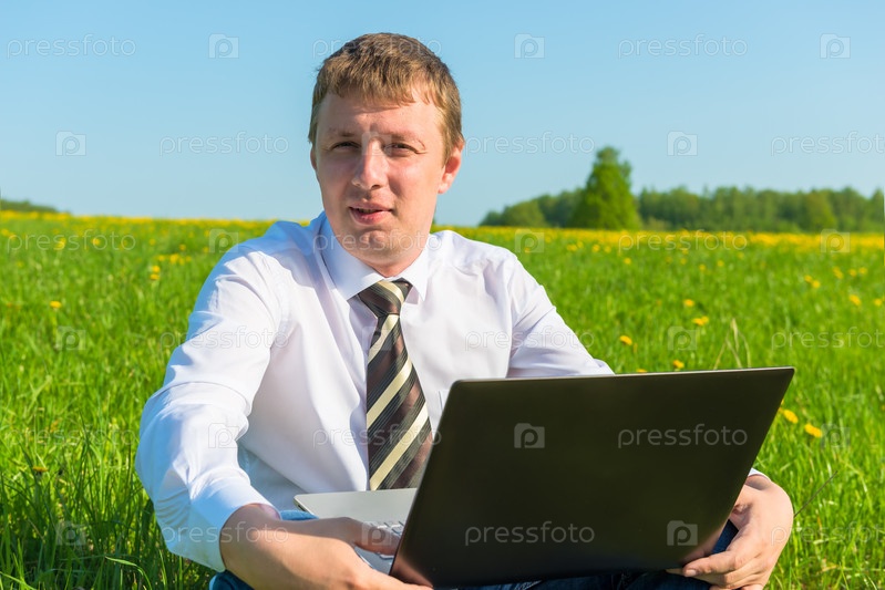 Мужчина с ноутбуком на природе