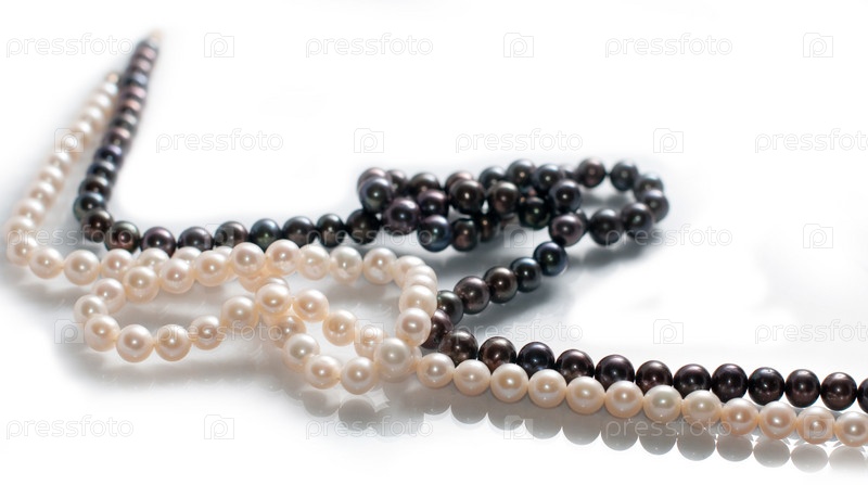 Две цепи из пресноводных жемчужных ожерелий, на белом фоне