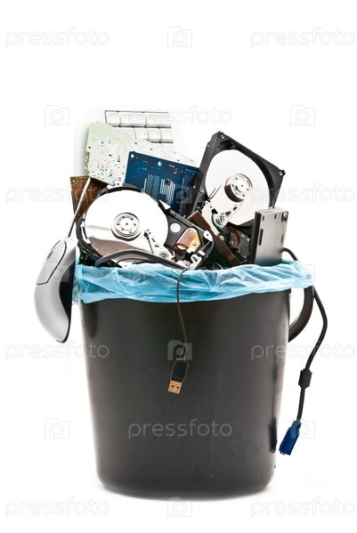 Детали от старого компьютера в мусорном ведре на белом фоне