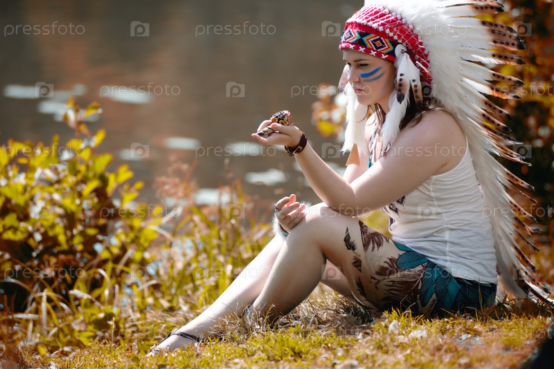 Молодая женщина, одетая в индейский головной убор, курит трубку