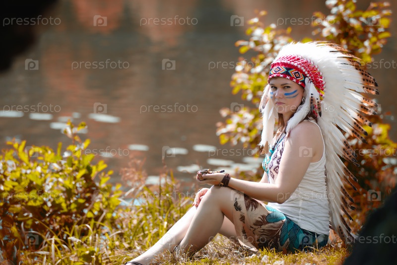 Молодая женщина, одетая в индейский головной убор, курит трубку