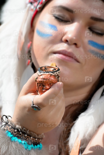 Молодая женщина, одетая в индейский головной убор, курит трубку